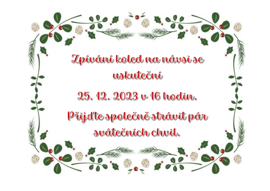 Na Boží hod, 25.12.23 se opět setkáme a zazpíváme si koledy. Začátek na návsi v 16 hod. Svařené víno bude připraveno.
